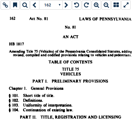 Session laws, also referred to as acts, are "the body of statutes enacted by a legislature during a particular annual, biennial, or special session" (Session Laws, Black’s Law Dictionary, 10th ed. 2014). In Pennsylvania, these may also be called pamphlet laws. The Pennsylvania Session Laws are available on HeinOnline, a membership database available to most Jenkins members.