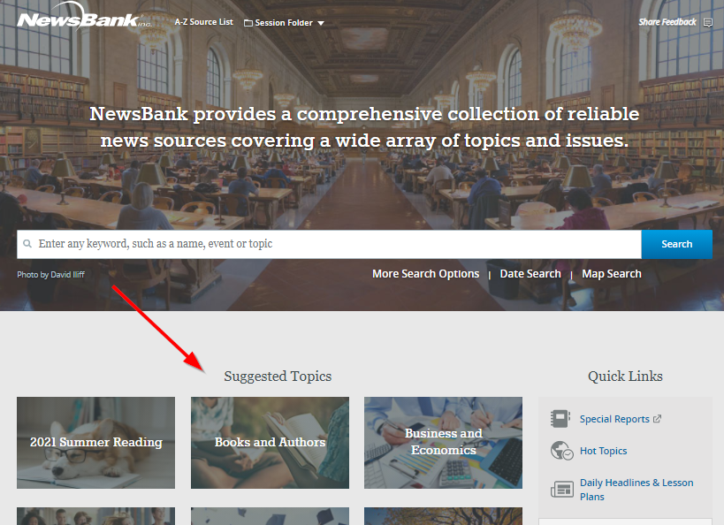 NewsBank, available to all members remotely as well as in the library, uses topic pages to help users with their research. The topic pages are organized by broad categories on the NewsBank homepage.